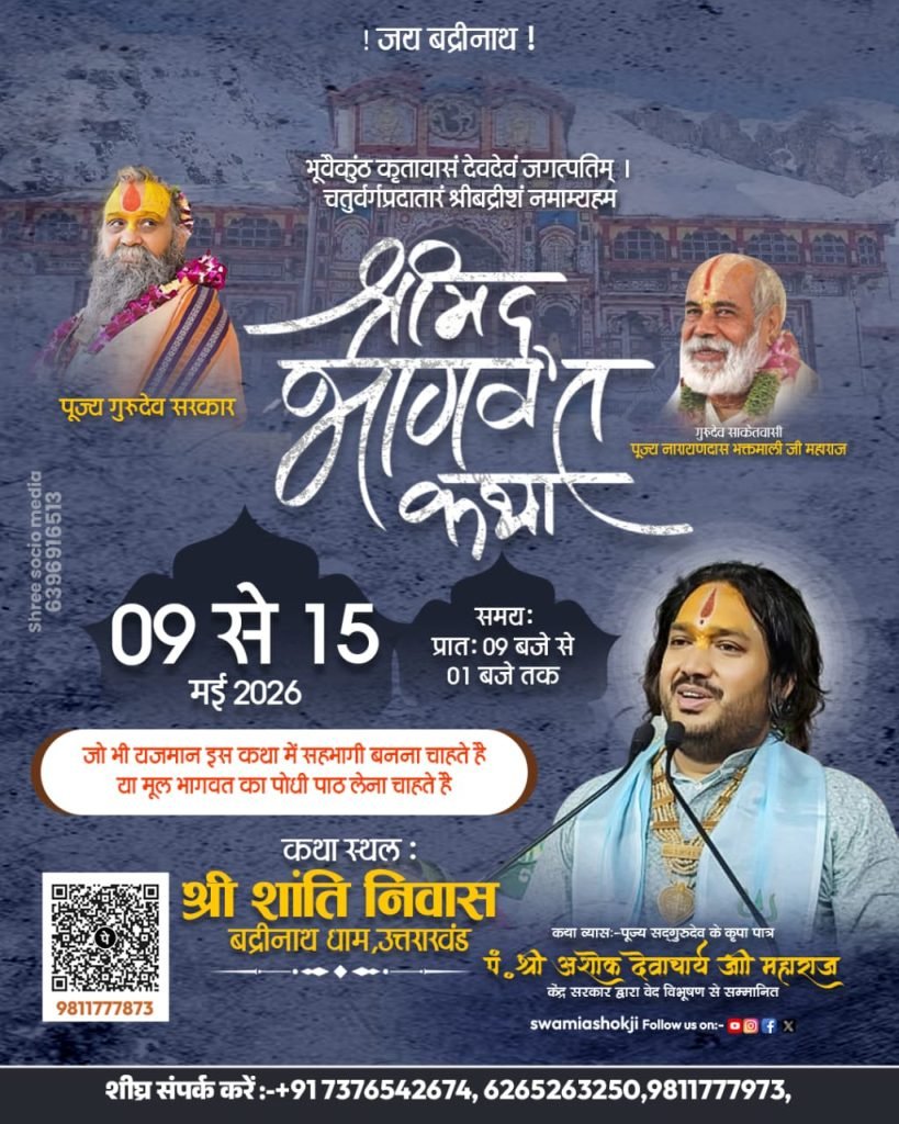 आप सभी को बताते हुए अत्यंत हर्ष हो रहा है कि श्री बद्रीनाथ धाम में संकल्पित कथा (यज्ञ), भागवत कथा एवं चारधाम कथा का समापन सत्र इस बार पूर्णाहुति कथा के रूप में आयोजित किया जा रहा है।
